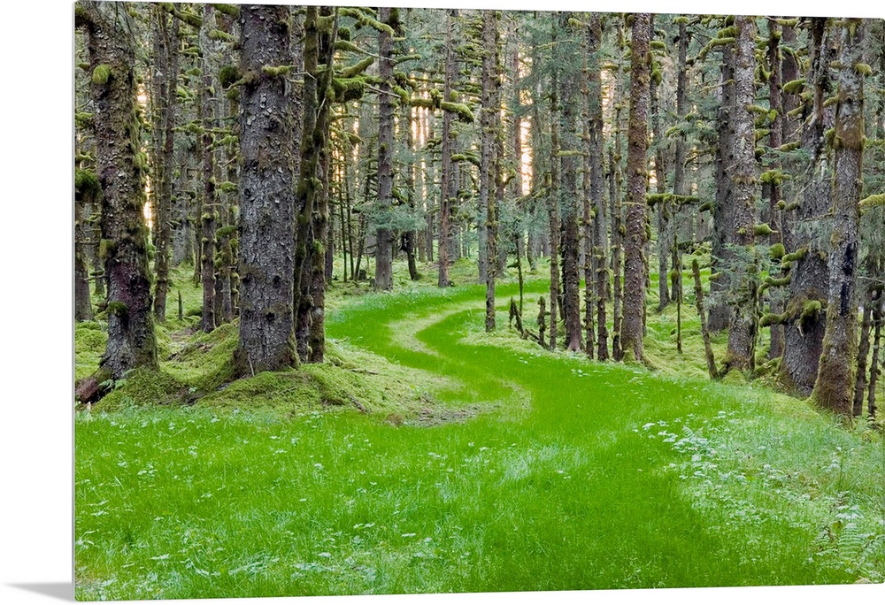 <p>Landscape photograph of an overgrown winding road through spruce trees and moss, coastal forest in Kodiak Island, Alaska.</p>