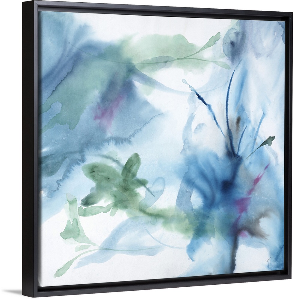 <p>A contemporary watercolor painting of shapes resembling plants, fading into the white background.</p>
