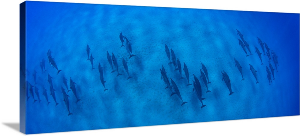 <p>Overhead view of school of dolphins swimming in Pacific Ocean, Hawaii, USA</p>