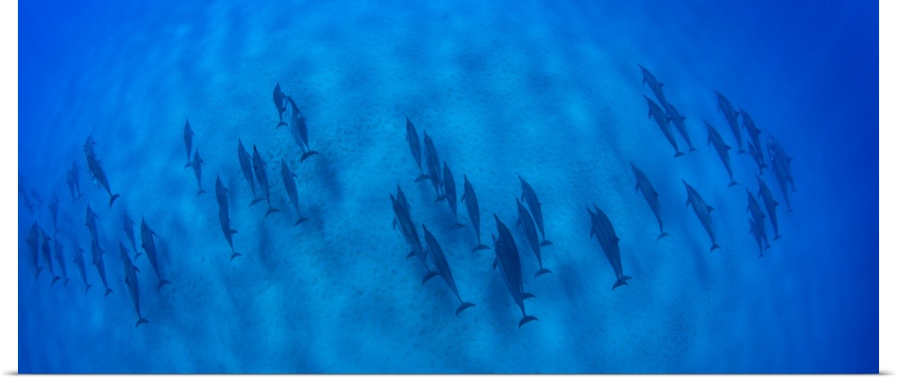 <p>Overhead view of school of dolphins swimming in Pacific Ocean, Hawaii, USA</p>