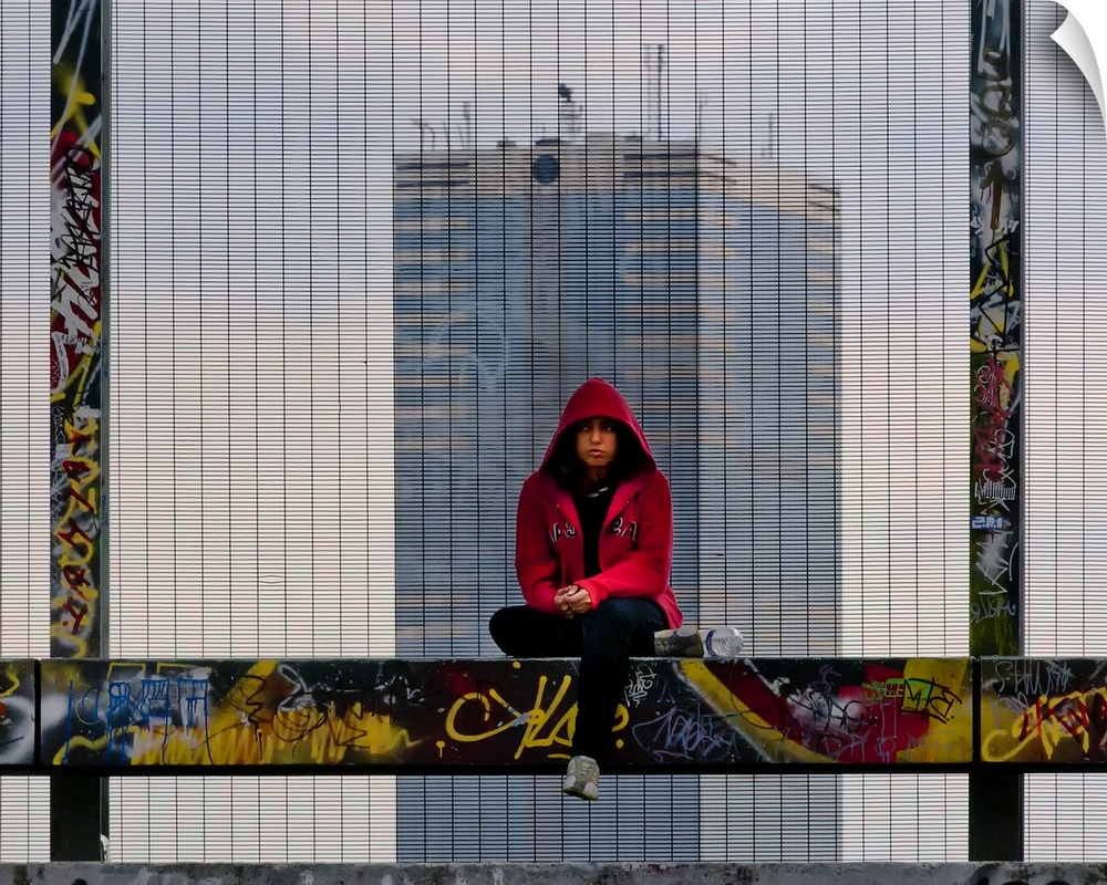 <p>Person sitting on a graffiti-covered railing with a skyscraper directly behind them.</p>