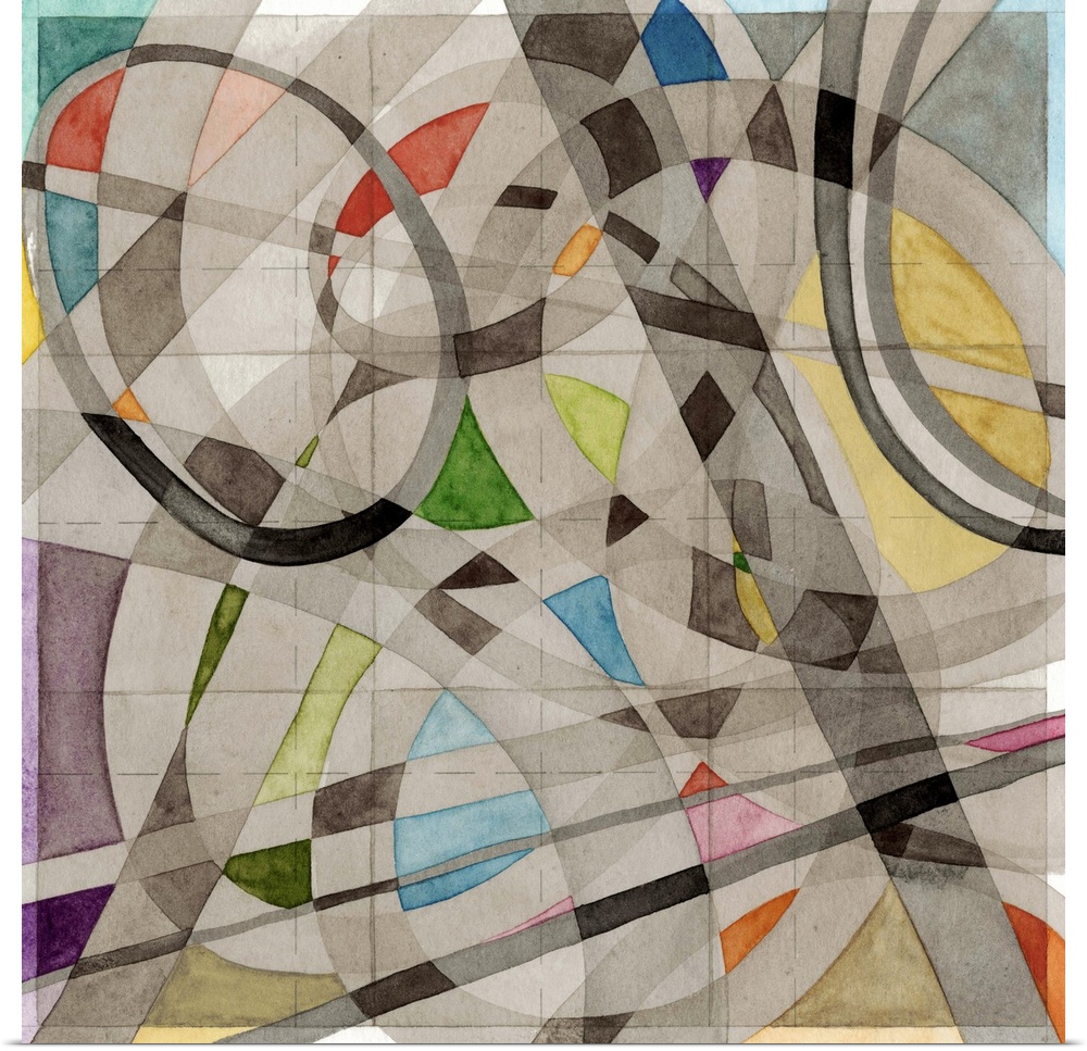 <p>Contemporary abstract painting using geometric shapes and bold semi-transparent colors.</p>