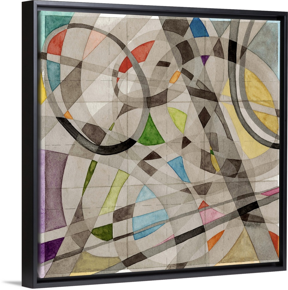 <p>Contemporary abstract painting using geometric shapes and bold semi-transparent colors.</p>