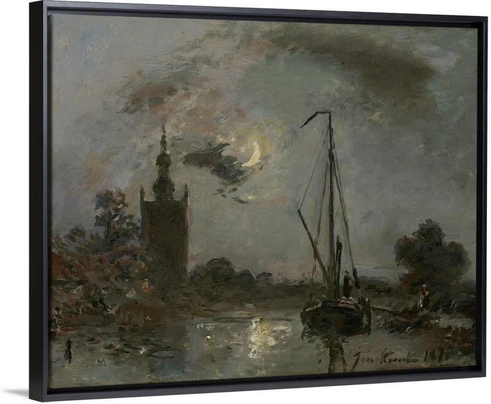 <p>Overschie in the Moonlight, by Johan Barthold Jongkind, 1871, Dutch painting, oil on canvas. Near Rotterdam, a sailboat is moored near a church tower.</p>