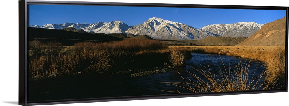 <p>A mountain range lines the background of this panoramic photograph with a river in the foreground surrounded by tall brush.</p>