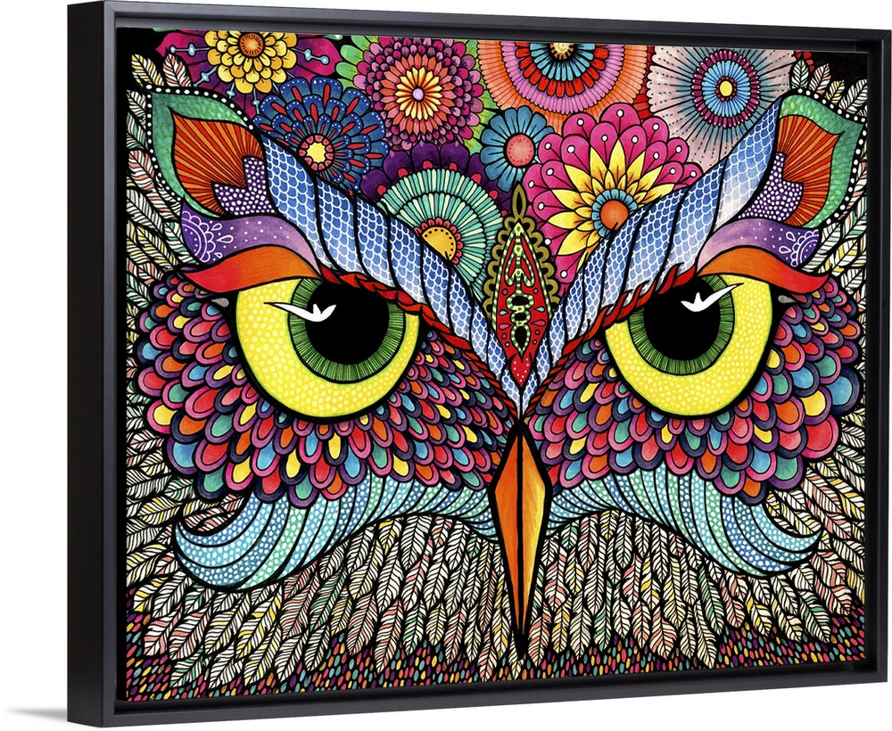 <p>Contemporary abstract artwork of a brightly colored and patterned owl face close-up.</p>