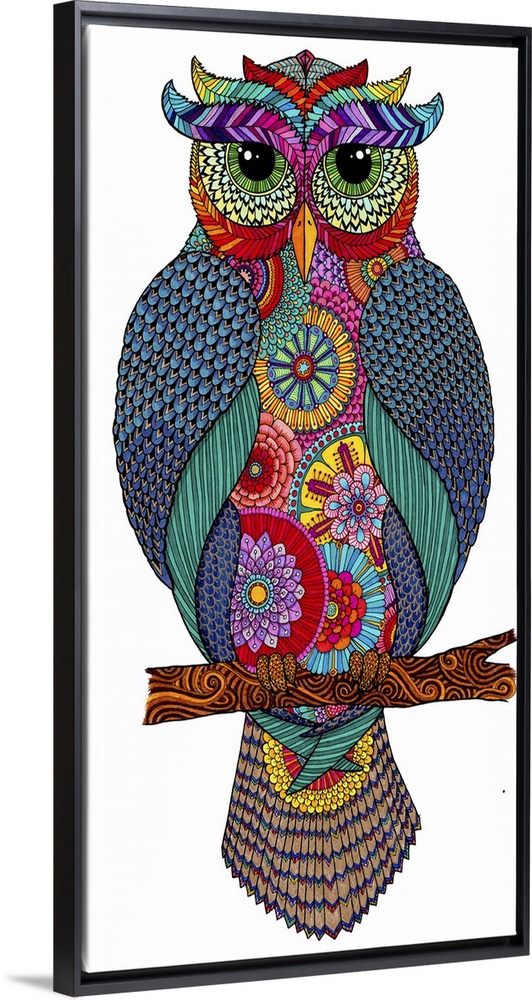 <p>Contemporary abstract artwork of a brightly colored and patterned owl perched on a branch.</p>