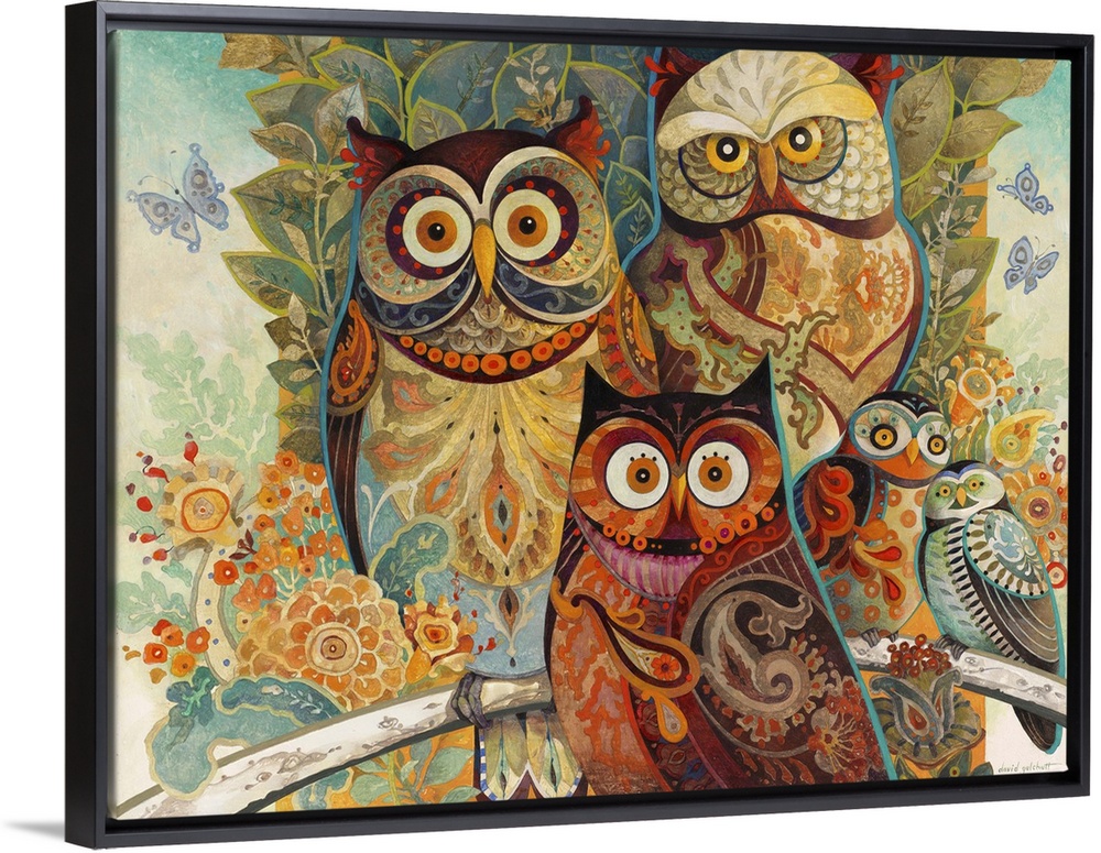 <p>Illustration of several owls in colorful paisley patterns.</p>