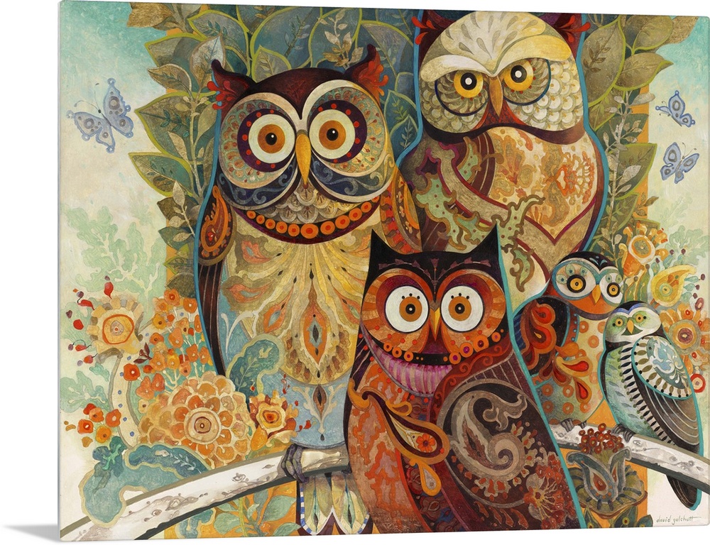 <p>Illustration of several owls in colorful paisley patterns.</p>