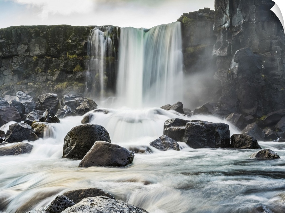 <p>Oxararfoss waterfall in Thingvellir, a historic site and national park. It's known for the Althing, the site of Iceland's parliament from the 10th to 18th centuries. On the site are the Thingvellir Church and the ruins of old stone shelters. The park sits in a rift valley caused by the separation of 2 tectonic plates, with rocky cliffs and fissures like the huge Almannagja fault; Blaskogabyggo, Southern Region, Iceland.</p>