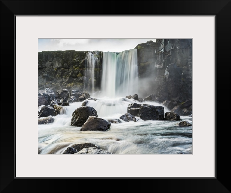 <p>Oxararfoss waterfall in Thingvellir, a historic site and national park. It's known for the Althing, the site of Iceland's parliament from the 10th to 18th centuries. On the site are the Thingvellir Church and the ruins of old stone shelters. The park sits in a rift valley caused by the separation of 2 tectonic plates, with rocky cliffs and fissures like the huge Almannagja fault; Blaskogabyggo, Southern Region, Iceland.</p>
