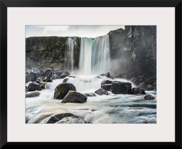 <p>Oxararfoss waterfall in Thingvellir, a historic site and national park. It's known for the Althing, the site of Iceland's parliament from the 10th to 18th centuries. On the site are the Thingvellir Church and the ruins of old stone shelters. The park sits in a rift valley caused by the separation of 2 tectonic plates, with rocky cliffs and fissures like the huge Almannagja fault; Blaskogabyggo, Southern Region, Iceland.</p>