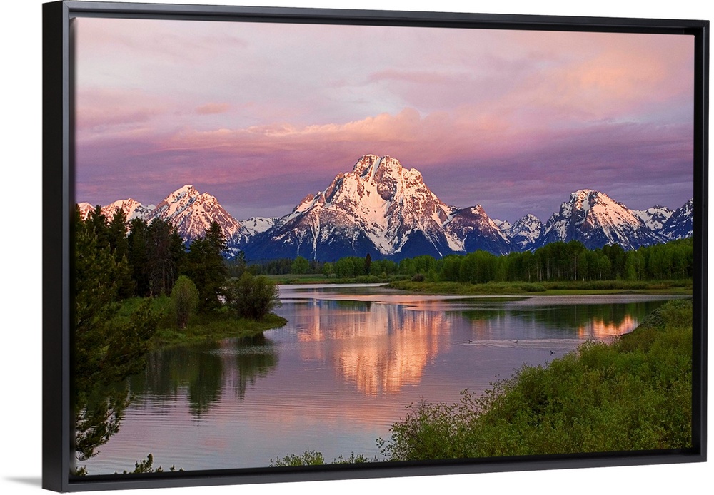 <p>Dawn at Oxbow Bend, part of Snake River in Grand Tetons National Park. Mount Moran reflected in waters of Snake River.</p>
