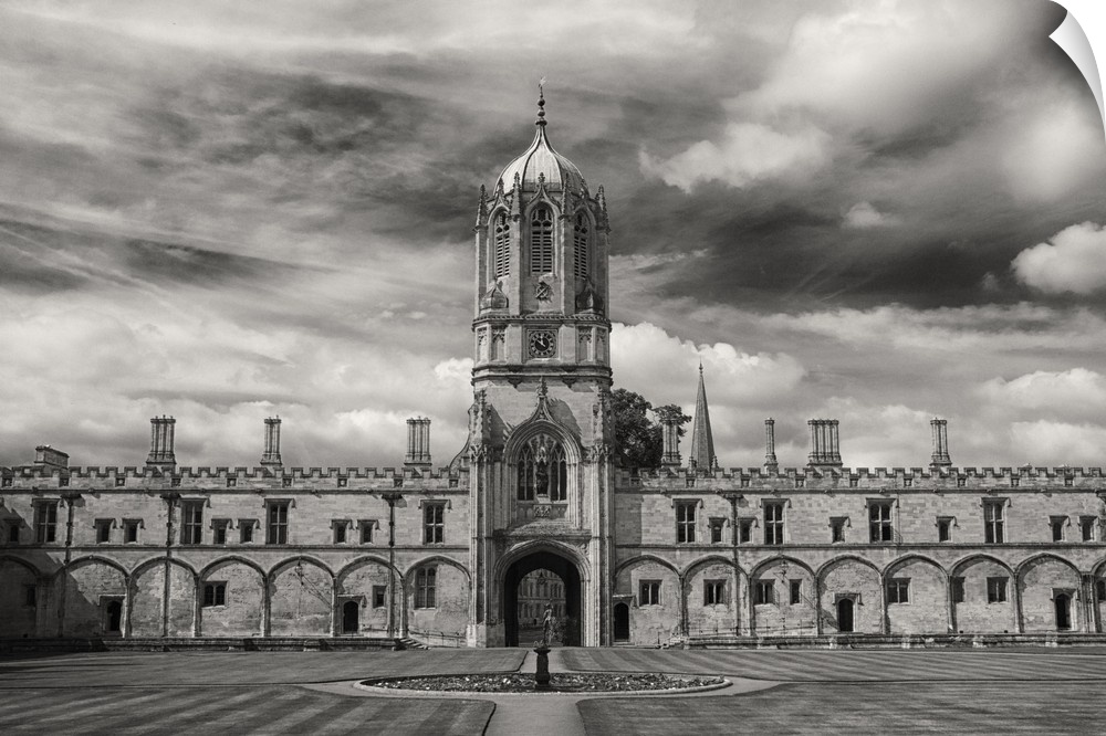 <p>Black and white photograph of the steeple of Christ Church at Oxford, England.</p>