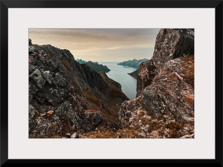 <p>Oyfjorden fjord view from steep hiking trail through red rocks of mountains, Senja island, Troms county, Norway, Scandinavia, Europe</p>