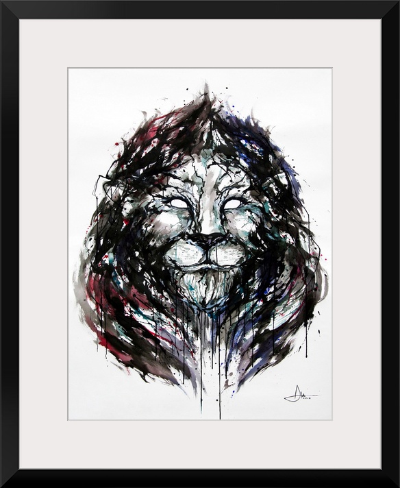 <p>Watercolor and ink painting of a lion's face with a large mane.</p>