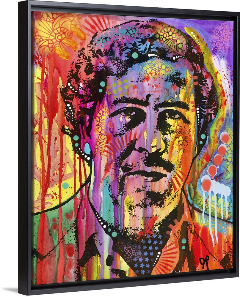 <p>Pop art style painting of Pablo Escobar with abstract designs and paint dripping all over.</p>