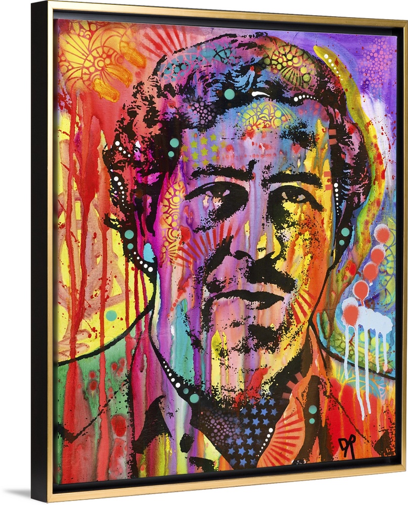 <p>Pop art style painting of Pablo Escobar with abstract designs and paint dripping all over.</p>