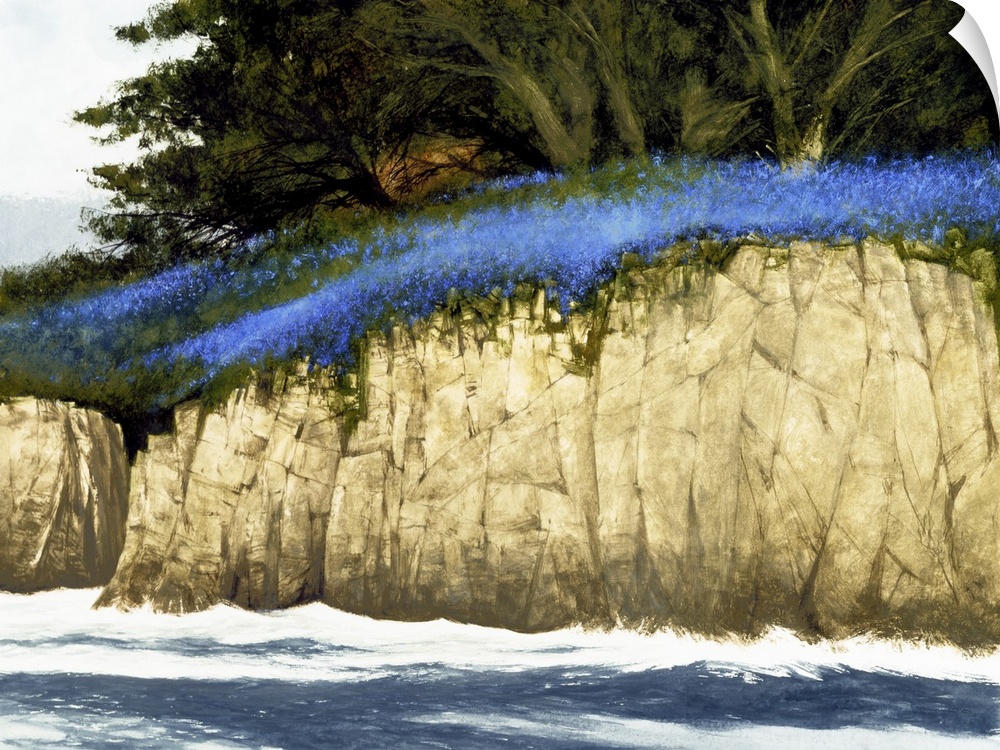 <p>Contemporary painting of a rocky seaside cliff full of blue wildflowers and lush green trees.</p>