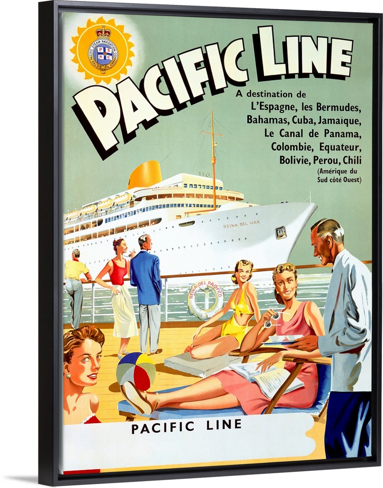 <p>Retro poster on canvas of people lounging on the deck of a cruise ship with another cruise ship in the distance.</p>