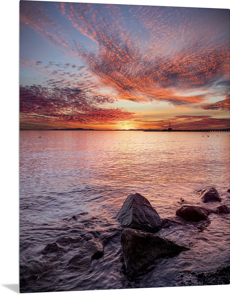 <p>Ocean view of blue sky with spectacular orange and pink clouds reflecting on the Pacific Ocean at twilight with the White Rock Pier in the distance, White Rock, British Columbia, Canada</p>