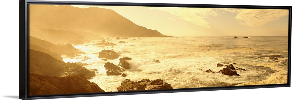 <p>Wide angle photograph on a big canvas of the Pacific Ocean along a rocky coast line in California, as the sun rises, casting a golden glow over the water.</p>