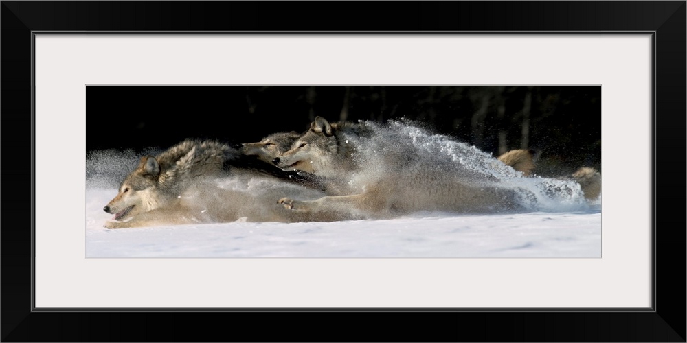 <p>Horizontal photograph on a large canvas of three wolves running through snow, in Alaska.</p>