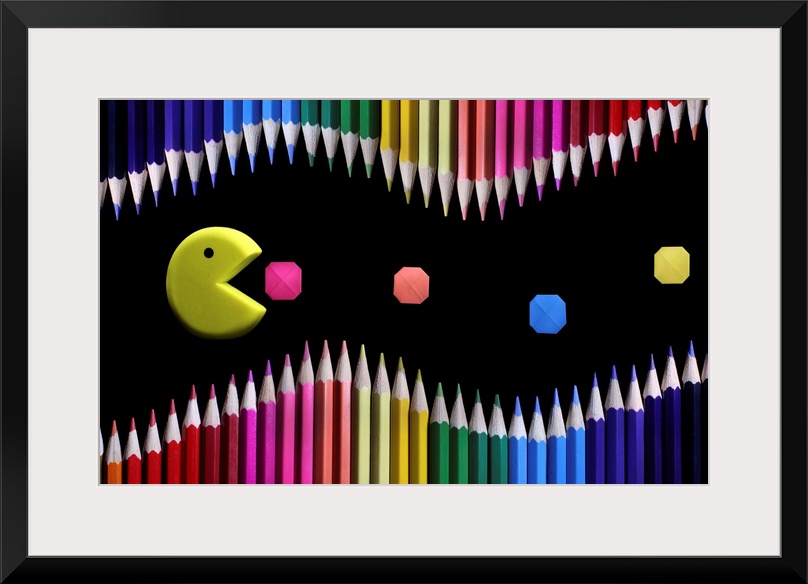<p>Conceptual photograph of a real pack-man eating gems along a colored pencil track.</p>
