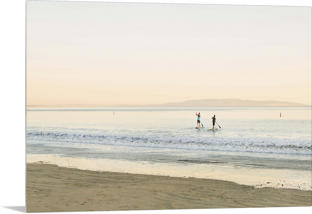 <p>Two paddleboarders in the ocean, seen from the shore.</p>