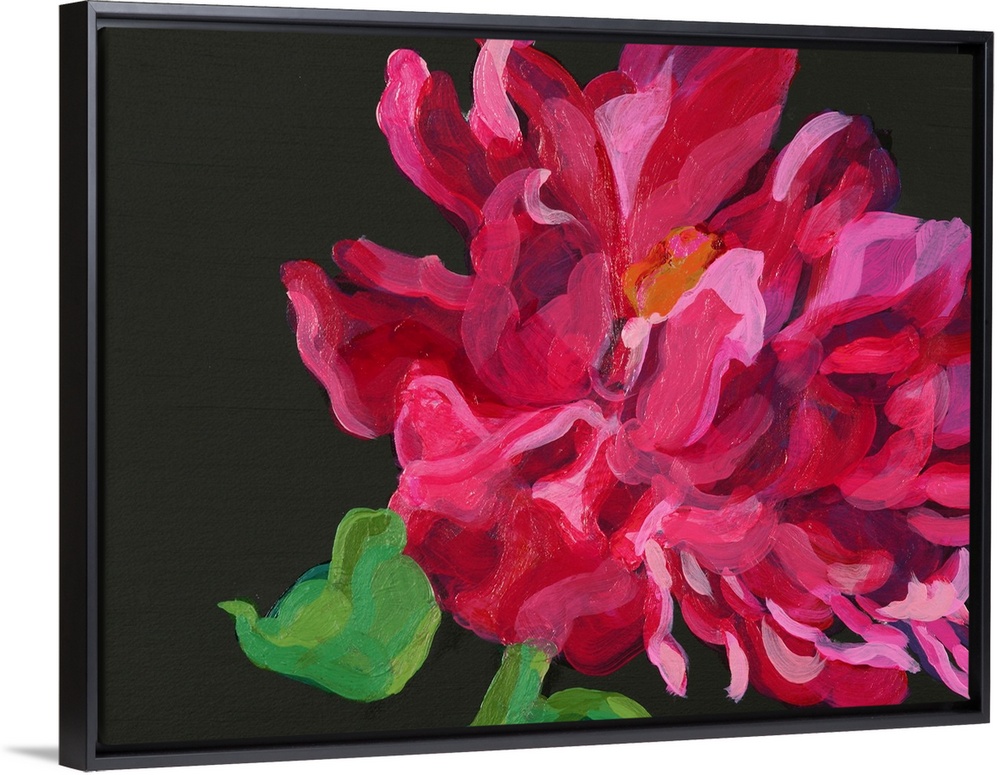 <p>Horizontal, floral painting of a single large flower with wavy petals, on a solid black background. Painted with thick, flowing brushstrokes.</p>