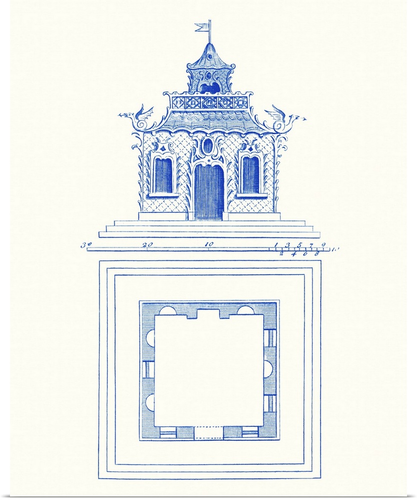 <p>Vertical decorative artwork of a simple pagoda blueprint featuring an architectural drawing.</p>