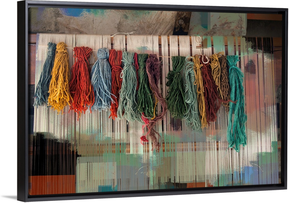 <p>Photograph of colorful bundles of yarn hanging on a line with an abstract background.</p>