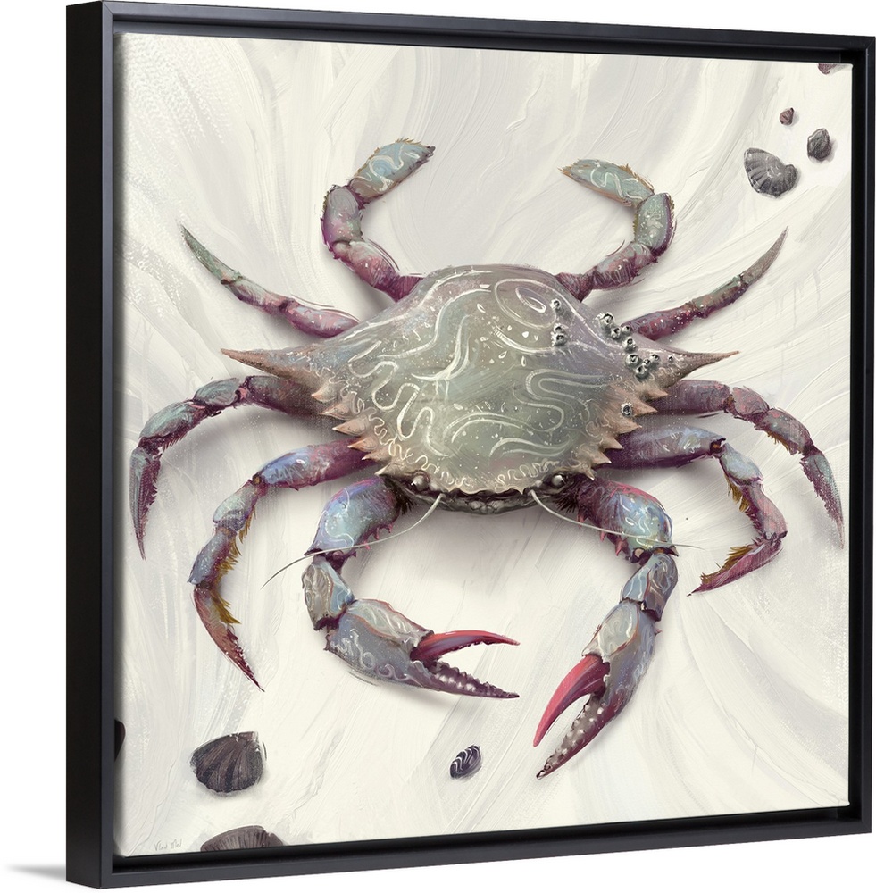 <p>Painting of blue crab with seashells on abstract background.</p>