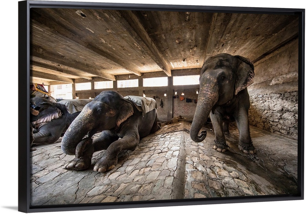 <p>Painted elephants in their sleeping area in Jaipur, India.</p>