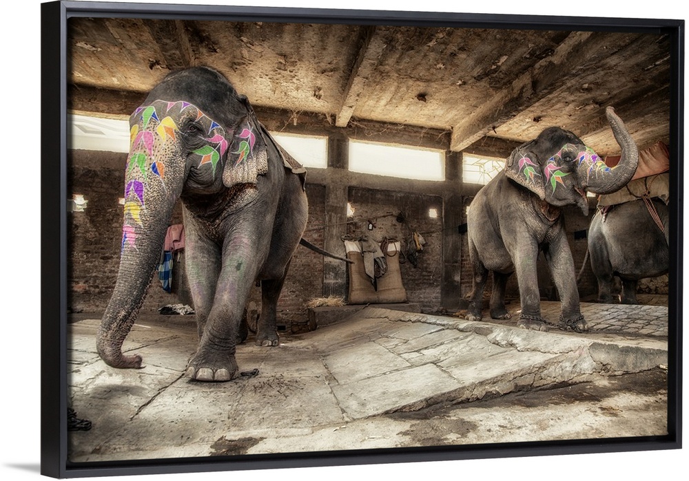 <p>Painted elephants in their sleeping area in Jaipur, India</p>