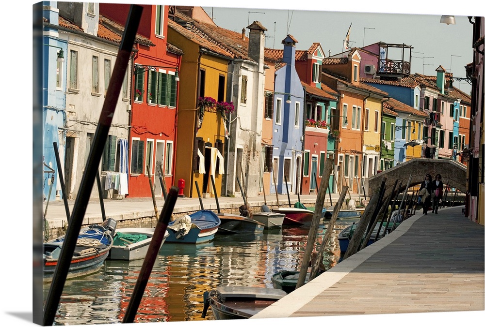 <p>Italy venice burano island canal water reflection river mediterrenean boat pole ship couple tourist walking sidewalk painted colorful fishermans houses homes frontdoor window penthouse roofs chimney bridge street shadow light sun sunny day sky streetlight window faade</p>