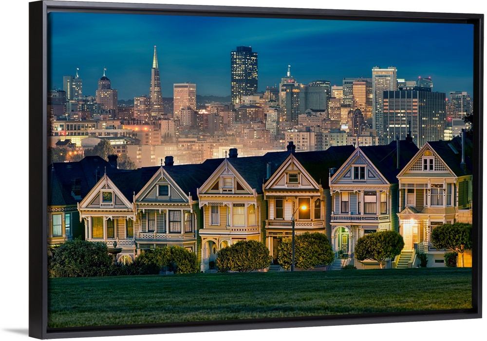 <p>Photograph of colorful row houses in San Francisco at twilight with the city skyline in the background.</p>