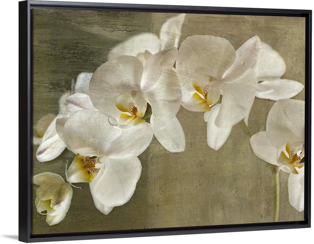 <p>Oversized, horizontal, fine art photograph of branch of large white orchids on a neutral background. The entire image has a slightly rough texture as if it were painted on stone or concrete.</p>
