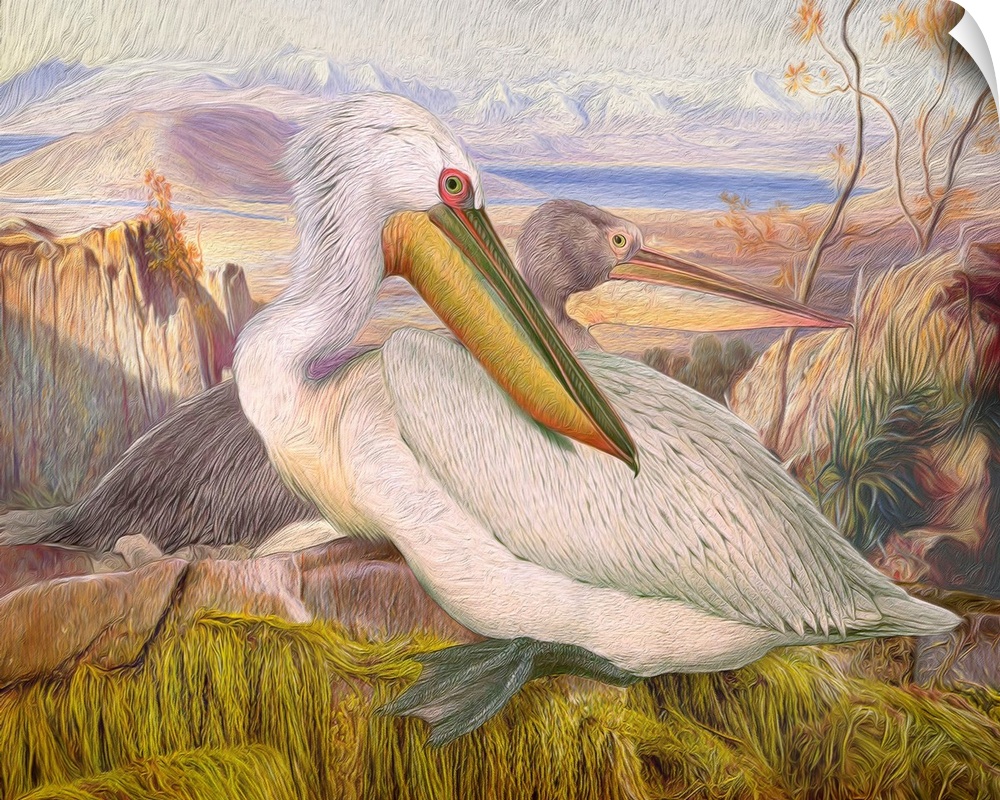 <p>A painterly textured rendition of two vintage white pelicans perched attop a mysterious seaweed covered sea side background.</p>