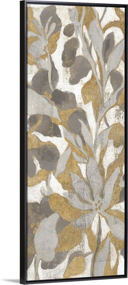 <p>Floral panel painting in gold, silver, gray, and white hues.</p>