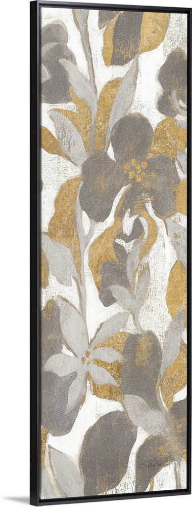 <p>Floral panel painting in gold, silver, gray, and white hues.</p>