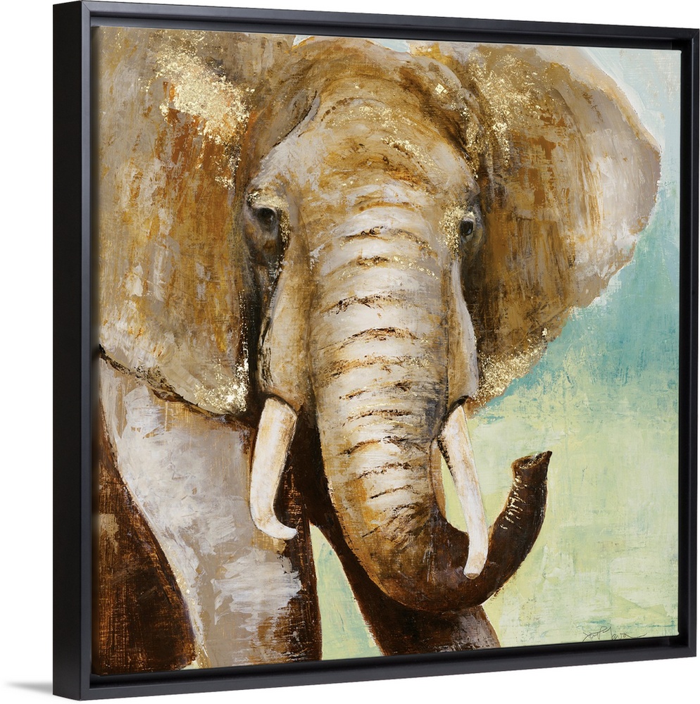 <p>Square painting of an elephant in brown tones with metallic gold highlights, on a blue and green background.</p>