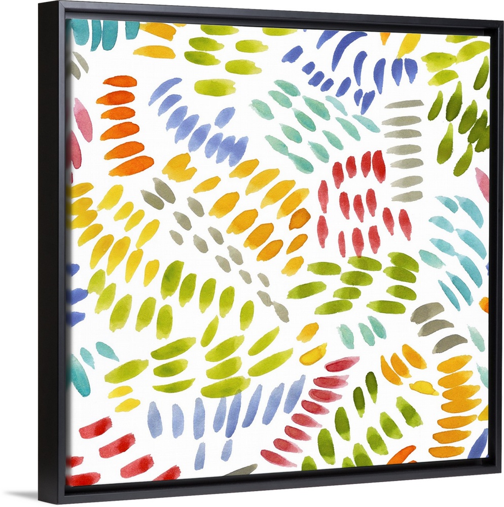 <p>Square decorative artwork of multi-colored brush strokes in a curved pattern on a white background.</p>