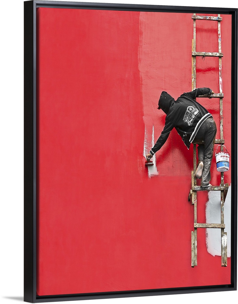 <p>A person hanging from a ladder, painting the side of a building bright red.</p>
