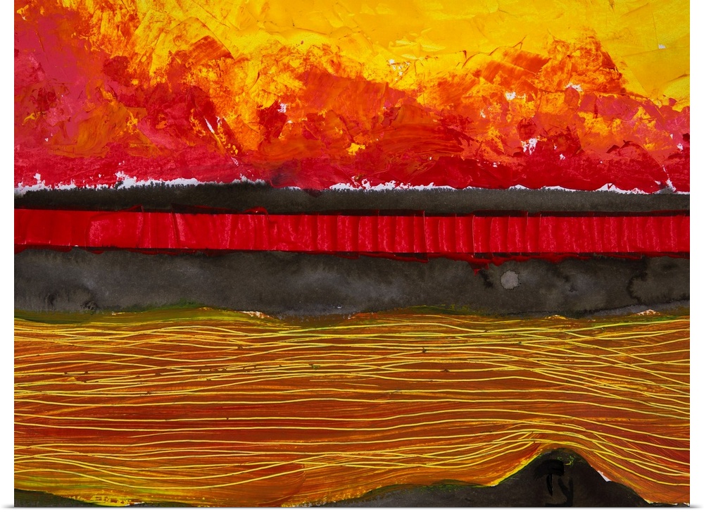<p>Painting of a colourful sunset reflected in water and the horizon.</p>