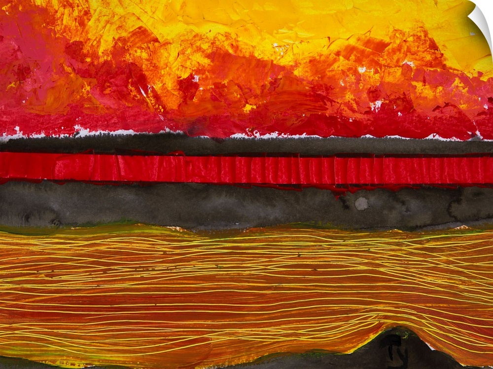 <p>Painting of a colourful sunset reflected in water and the horizon.</p>