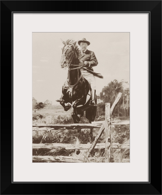 <p>Painting of Theodore Roosevelt jumping a horse over a fence.</p>