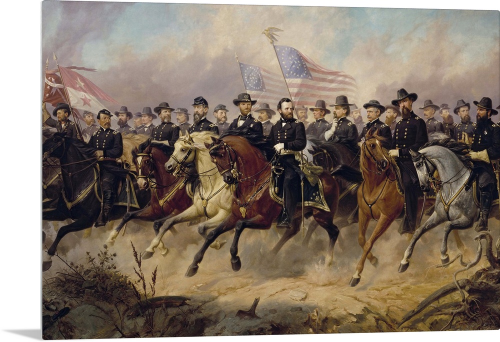 <p>Painting of Ulysses S. Grant and his Generals by Ole Peter Hansen Balling. The Generals, left to right, are Devin, Custer, Kilpatrick, Emory, Sheridan, McPherson, Crook, Merritt, Thomas, Warren, Meade, Parke, Sherman, Logan, Grant, Burnside, Hooker, Hancock, Rawlins, Ord, Blair, Terry, Slocum, Davis, Howard, Schofield, and Mower.</p>