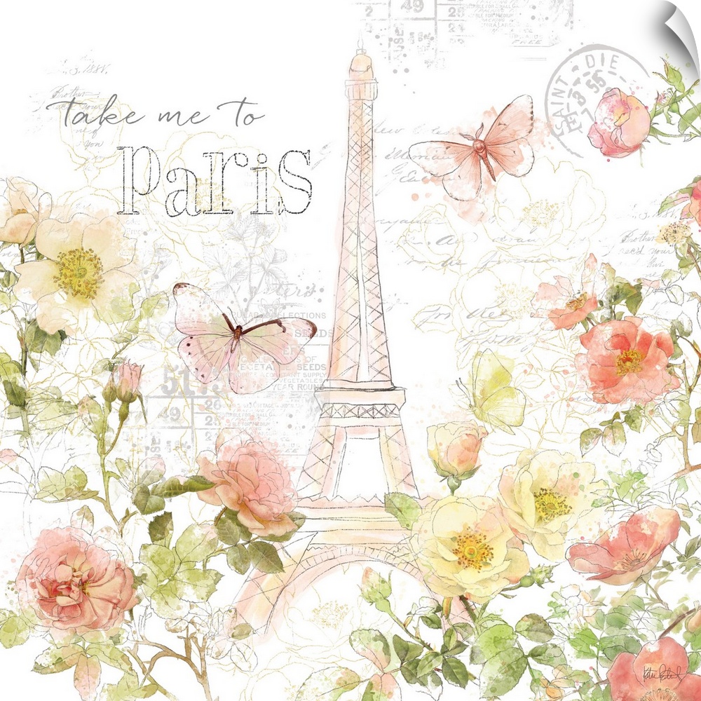 Art Decorative Art Florals Rose Graphic Art Katie Pertiet Paris Eiffel Tower Butterfly