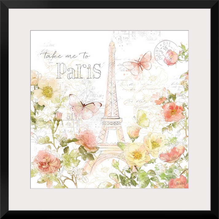 Art Decorative Art Florals Rose Graphic Art Katie Pertiet Paris Eiffel Tower Butterfly